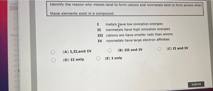 Solved Identify The Reason Why Metals Tend To Form Cations Chegg Com